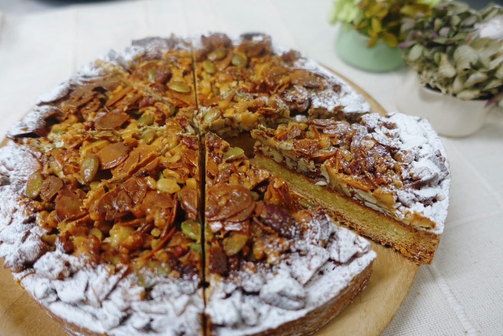 その上にキャラメルヌガー(フロランタンの上部分のような香ばしいキャラメルナッツ層)をのせて焼き上げました。